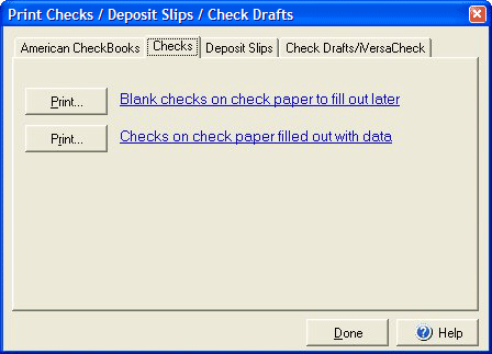 The Checks tab will allow you to print blank checks, filled checks on blank paper and filled checks on pre-printed check paper. Click the first option, Blank checks on blank check paper to fill out later, to print blank checks to hand-fill later. The Checks on Check paper filled out with data will print checks with data for payee, amount, etc. Other print options are available by using the American Checkbooks, Deposit Slips, and Check Drafts/iVersaCheck tabs. |