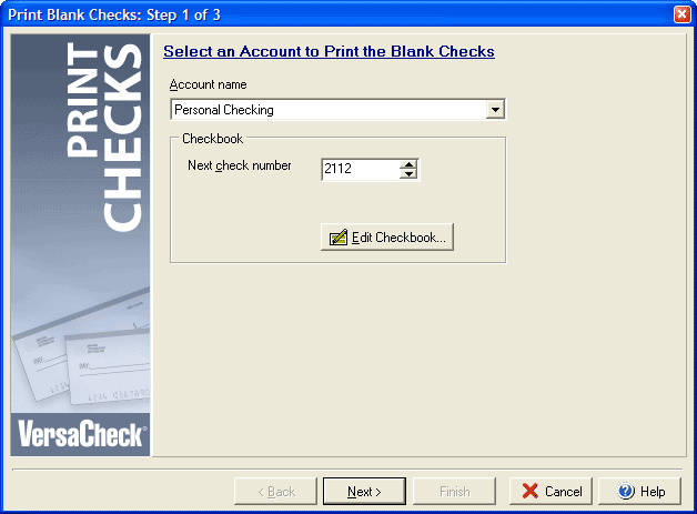 From the Account name drop down menu select the account from which you want to print checks. In the Checkbook section enter the Next check number in the corresponding field. If you need to make changes to the checkbook for the account you are using you can click the Edit Checkbook... button to open the Checkbook Information wizard. Click Next to continue to Step 2. |
