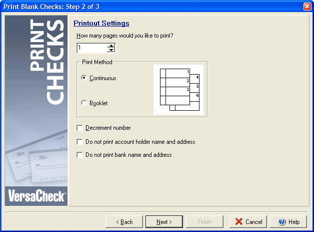 Determine the number of pages you wish to print and enter that number in the How many pages would you like to print field. (Remember that personal checks usually print 2 or 3 checks per page and business style checks print 1 to 3 checks per page, depending on the paper and layout style you choose.) Under the Print Method section choose whether to print continuously or in booklet format (note that this is not the same as printing a checkbook, to print checkbooks use the Print Checkbook wizard.) Check the Decrement number box to decrease (rather than increase) check numbers as they print. If you wish to prevent the account holder information or the bank information from printing on the checks, you can check the corresponding boxes for each option. Click Next to continue to Step 3 or click Back to return to Step 1. |