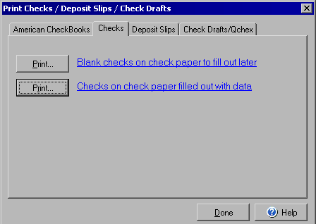The Checks tab will allow you to print blank checks, filled checks on blank paper and filled checks on pre-printed check paper. Click the first option, Blank checks on blank check paper to fill out later, to print blank checks to hand-fill later. The Checks on Check paper filled out with data will print checks with data for payee, amount, etc.