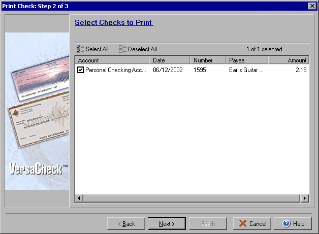 main VersaCheck screen and then selecting Print checks on check paper filled out with data from