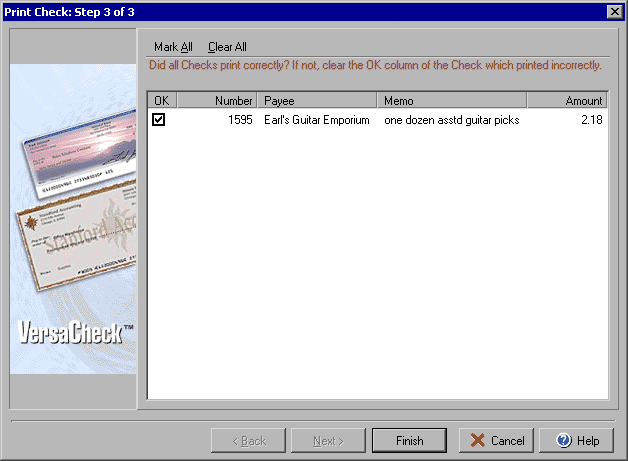 In Step 3 of the Print Check process you will deselect any checks that did not print out correctly so that you may reprint them as needed. In the OK column clear the check box for any check that didn't print correctly. You can select all items by clicking Mark All or deselect all the items by clicking the Clear All button.