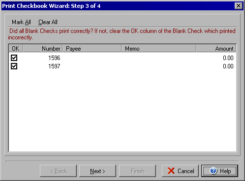 Step 3 of the Print Checkbook Wizard allows you to reprint any checks that did not print correctly. Uncheck the OK box for any checks that did not print correctly. You can use the Mark All button or the Clear All to select all the items or to clear all of the items.