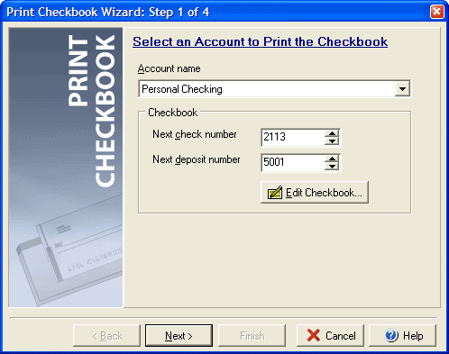 Step 1 of 4 The Print Checkbook Wizard walks you through printing out checks to make a checkbook.