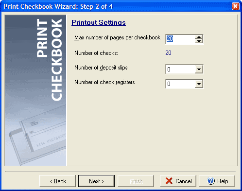 In the Printout Settings section of the Checkbook Wizard you can select the total number of items that will print for your checkbook in the Max number of check field. This will include the number of checks, plus the number of deposit slips (if any), plus the number of check registers (if any). The Number of Checks that will print (always in multiples of 2 since there are 2 blank checks on a page for form 3002/ACB style checks) will be the number in the Max number of check field minus the number of deposit slips and check registers. In the Number of deposit slips and Number of check registers fields you can select to print 0, 2, or 4 deposit slips or check registers respectively. You can select the account to use in Step 1, verify the printing in Step 3 and confirm the print in Step 4. |