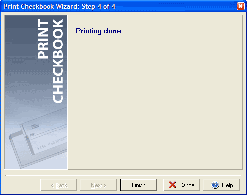 Step 4 of the Print Checkbook Wizard simply confirms that the print job has completed. You can select the account to use in Step 1, change the number of checks in Step 2 or verify the printing in Step 3. |