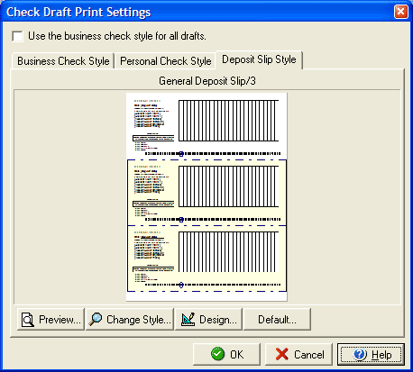 Deposit Slip Style The Check Draft Print Settings dialog will allow you to set up the style of checks and deposit slips used when you print check drafts. From the Print Check Draft Wizard click the Setup button.