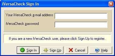 The iVersaCheck Sign In dialog box allows you to log in to your iVersaCheck account (http://www.iVersaCheck.com).