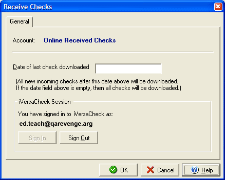 In the Date of last check downloaded field you an leave the date that you last downloaded checks and receive only new incoming checks or you may clear the field and receive all checks. If you are not already signed in to iVersaCheck you can click the Sign In button to connect to your account. |
