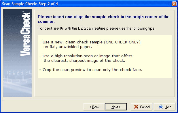 Step 2 of 4 The VersaCheck-EZ-Scan™ wizard allows you to scan a sample of your preprinted check for quick set up of bank code line and check number information when setting up checkbook information for accounts. From Step 2 of the Edit Checkbook wizard click on the Scan Sample Check button.