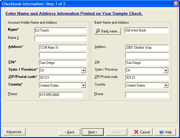 Step 3 of the Checkbook Information wizard will setup the Account Holder and Bank addresses for the checkbook. (Note: all fields in bold type with an *asterisk are required fields.) Under the Account Holder Name and Address section you may enter 1 or 2 names as well as the address, city, state, Zip code, country and phone number that should appear on the account. In the Bank Name and Address section you may enter the name, street address, city, state, Zip code, country and phone number of the financial institution from which your checks will be drawn. You can lookup the bank information automatically by clicking the Bank name button. Click Next to continue to Step 4 or Back to return to Step 2.Clicking the Advanced button will allow setting up special encoding if needed. |