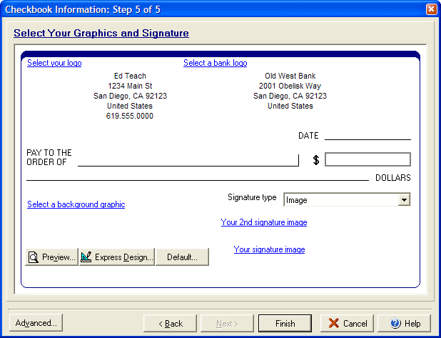 You can view the check by selecting the Preview button or you can edit the check face by selecting the Design button to open the check designer. Clicking the Default button will return all settings to the original settings. Click Back to return to Step 4 or Finish to complete the setup.Clicking the Advanced button will allow setting up special encoding if needed. |