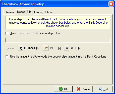 The Deposit Slip section of the Check Book Advanced Setup dialog box can be used if your deposit slips have a different bank code line than that of your checks. By clicking the check box at the top of the dialog box, you can use the special bank MICR line buttons in the dialog box to enter the bank line as it appears on your deposit slips. You can also use the General tab of the Checkbook Advanced Setup to move or encode the bank code line or set Printing Options under the Printing Options tab. |