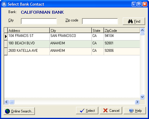 Enter the city and/or the zip code for the branch you are looking for and press Find. In the list that displays, click the address of the correct branch to highlight it and then click the select button. If the address for your bank does not appear you can click the Online Search... button to connect to the Internet and search a complete bank address database. |