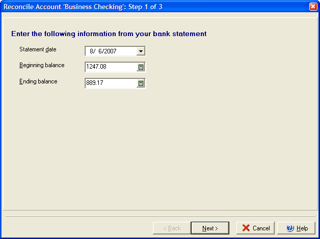 In the first step of the Reconcile wizard, simply enter the Statement date (or date you'd like to mark the account as reconciled) and enter the Beginning and Ending balance for the period. Click Next to continue on to the second step of the Reconcile wizard. |