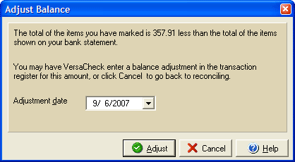 You can reconcile your accounts in VersaCheck against statements or other records by using the simple Reconcile Wizard. If the reconcile wizard finds that items in your statement don't match up with the items in your VersaCheck account, you can use the Adjust Dialog box to enter a balance adjustment in the account.