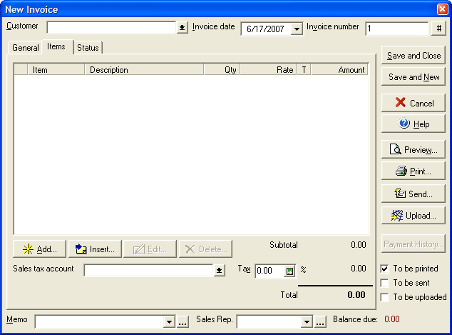 Use the General tab to add shipping, billing, and general information to the invoice. Once you have finished entering information click Save and Done to save the invoice and close the dialog box or select Save and New to save the current invoice and then start a new invoice. You can preview how the invoice will appear upon print out by selecting the Preview button, or you can print the invoice directly by selecting print. To view any available payment history for the current invoice, select the Payment History button; this will show any customer payments made to this invoice transaction. Click the Send Invoice button to open the Send Invoice wizard. By clicking the Verify Shipping Address button, you can verify the street address of the shipping destination. |