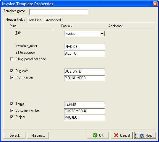 The Header Fields tab of the Invoice Template Properties dialog box allows you to customize the header captions of each field on the invoice, as well as whether to include certain fields on the invoice. Each field that contains a check box next to its name in the Print column may be included by placing a check mark in the box. In the Caption column you may change the title caption for each field or leave the default as it appears. You may add a logo or print a company address using the Company Information tab or you can customize the items section of the invoice by using the Advanced tab. |