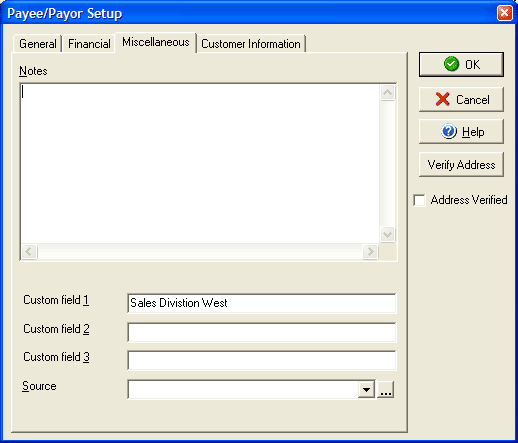 The Miscellaneous section of the Payee Setup allows you to enter Notes about