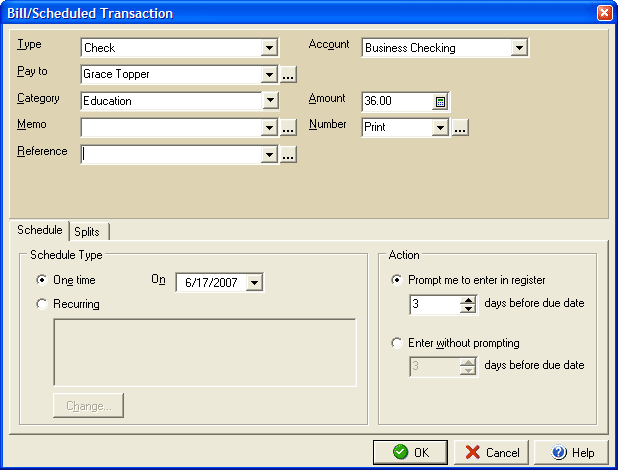 by using the Bill/Scheduled Transaction dialog box. From the Bills