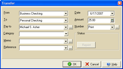 transfer transaction. By clicking the Reprint button, you may reprint the check