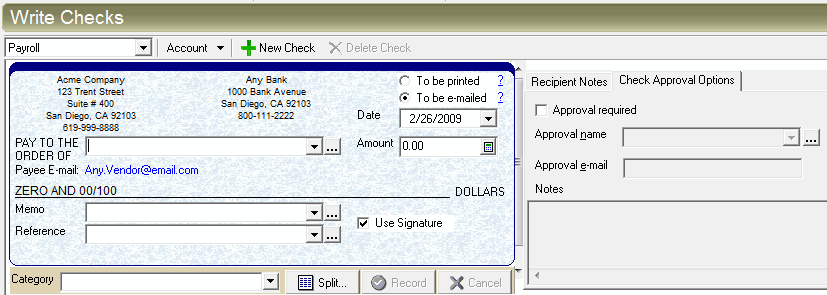The Write Checks screen allows you to write checks drawn off of any bank or money