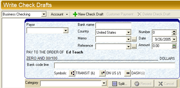 The Write Check Drafts screen allows you to write checks drawn off of the bank