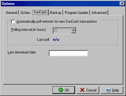 The SunCash tab of the options menu allows you to set a poll frequency, that is how often the program should check for new SunCash transactions, by clicking on the Automatically poll network option and entering a time interval. You can also see the date of the last recorded download.