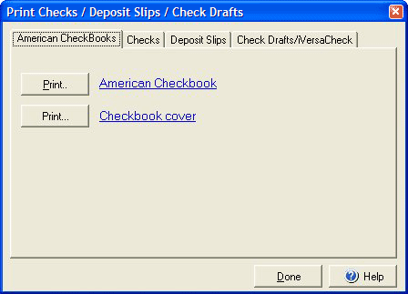 American Checkbooks The Print Checks / Deposit Slips / Check Drafts dialog box works as a menu to open the print wizards for different types of checks, deposit slips, etc. From the main VersaCheck window click the Print button.