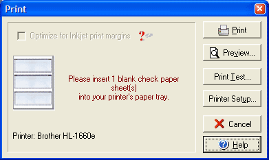 Clicking the Print button will send the print operation on to your printer, while using the Preview button will allow you to view what the output will be. The Print Test... will allow you to print a test check to insure that the check prints out and lines up correctly. The Printer Setup button will open the standard printer dialog box that allows you to adjust printer properties, or you can Cancel the print job. Printing with inkjets and optimization: |