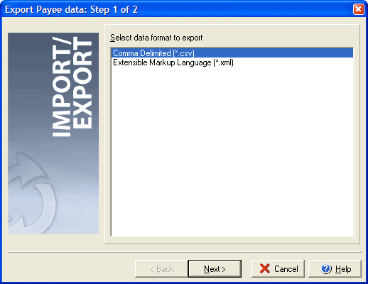 Step 1 of 2 Using the Export Payee Data feature will allow you to create a file that contains all of the information about the Payees in your Payee List. By exporting Payee data you can easily create spreadsheets or reports in other software programs from the information built in your VersaCheck files. The Export Payee Data wizard can be opened from the File menu by clicking Export and then selecting Payees.
