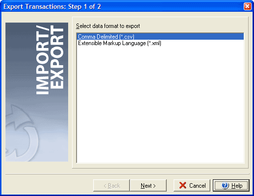 Step 1 of 2 The Export Transactions feature will allow you to export transactions from within VersaCheck to use with other software or files. Once you have selected the transactions to export, the Export Transactions wizard will allow you to create the export file. The Export Transactions wizard can be opened from the File menu by clicking Export and then selecting Transactions.