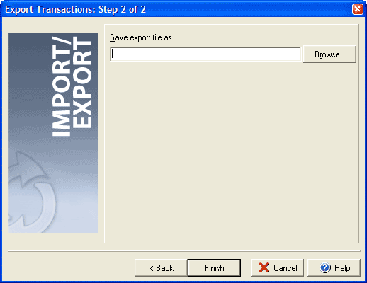 Step 2 of 2 The final step of the Export Transactions process determines the location and name of the export file. The Export Transactions wizard can be opened from the File menu by clicking Export and then selecting Transactions.