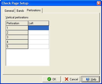 The Perforations tab will allow you to view the location (in inches from the left) of any vertical perforations (usually found on personal, but not business checks). If you selected "custom" as the Style under the General tab you will also be able to edit or add new perforations by entering them in one of the five fields. By clicking the General tab you can select the check style, and by clicking the Bands tab you can view the size and location of the different sections of the document. |