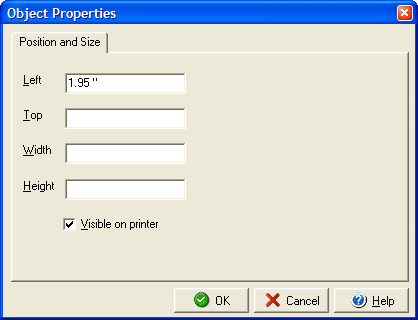 You can determine the objects location by entering the distance in inches for the left side in the Left field and the distance in inches from the top in the Top field. You can set the width and height of the bounding box in the corresponding Width and Height boxes. You can prevent the object from printing on the face of the check by unchecking the Visible on printer box. |