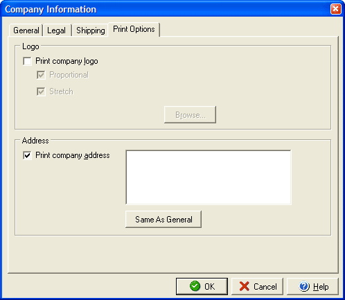 The Print Options tab allows you to select whether to use a company logo on invoices and estimates and which, if any, address to print. To add your logo check the Print company logo box and then click the Browse... button to search for the image to use. If you check the Proportional check box the image will be forced to constrain it's height and width dimensions (to prevent the image from looking stretched out.) By checking the Stretch box the image will be resized to fit within the space allotted for logos on the invoice template by either enlarging or shrinking the image to fit. It is best to leave both these options checked. If you wish to have an address print on invoices and estimates, make sure the Print company address box is checked and enter the address to use in the text field. If you wish to use the general address, click the Same As General button. You can also add or edit information about your company with the General, Legal and Shipping tabs. |