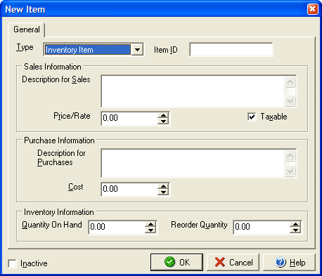 The Type drop down menu will allow you to select what type of item to create (e.g., an inventory item, service, etc.). Use the Item ID field to give each item it's own unique ID. In the Sales Information section enter a sales description of the item and price for the item or service. If the Taxable check box is checked then the item will have sales tax generated for it whenever it is added to invoices and estimates. In the Purchase Information section (for inventory items only) the Description for Purchases section will automatically duplicate the description from the sales section, although you can manually add to or edit the description. Enter the your cost per item in the Cost field. In the Inventory Information section (for inventory items only) you can enter the quantity of the item that you currently have on hand and at what quantity the item needs to be reordered. VersaCheck will automatically track the inventory by decreasing the quantity on hand as the item is added to invoices. Clicking the Inactive button will keep the item in the Item List but will prevent it from showing up as an item to add to invoices or estimates. |