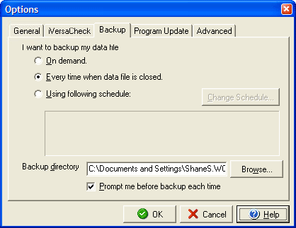 The Backup option allows you to select how often the VersaCheck program will attempt to create a file backup of your data. The default is set to backup data each time the application is closed. (This is highly recommended to insure that your backups are always the most recent and up to date information.) You may also select On demand which will only backup information when you select the Backup option found under the File menu, or you may select a schedule by selecting Using following schedule and clicking the Change Schedule button. The Backup directory used to store the VersaCheck backup data files may be changed to a different directory by clicking the Browse button. By unchecking the "Prompt me before backup each time" box you can eliminate the pop up confirmation box that appears when closing the program, so that VersaCheck will back up with out prompting you first. |