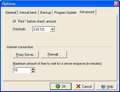 By leaving the "Print * before check amount" box checked, checks will print with a row of asterisks before the check amount as an added security measure. You may uncheck the box to remove the asterisks before the check amount if you wish. The Advanced Tab will also allow you to open the dialog box for setting up connection through a proxy server or a secure proxy server. If you are not connected to a local network and/or are using a modem for your Internet connection, then you are probably not using a proxy server. The Maximum amount of time to wait for a server response option will allow you to set how long, in minutes, the program should continue to attempt a connection to the server before timing out. (If the connection is not successful this will keep the program from freezing up because it is continuing to attempt a failed connection.) |