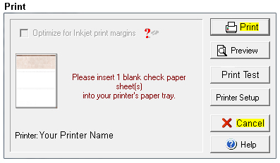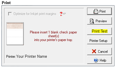 15. The Print screen will appear. You can choose to print the blank check by selecting the PRINT button or you can exit this screen by clicking on the CANCEL button and closing each screen in succession behind it. Your changes to the bank code line have been saved and will not change unless you adjust them again at a later date or click the RESET button on Print Test Check: Step 2 of 3.