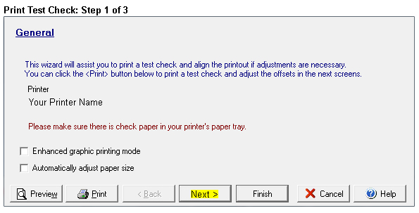 11. The Print Test Check Step 1 of 3 screen will appear. For our purposes, simply click on the NEXT button to continue.