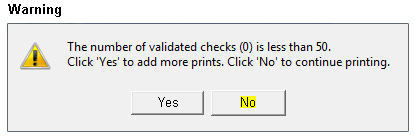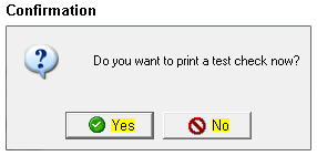 12. A Confirmation screen will appear asking you if you would like to print a Test Check. If you do not have a print out to go by then print out a Test Check by click on the YES button. If you already have a sample to work from click on the NO button to proceed.