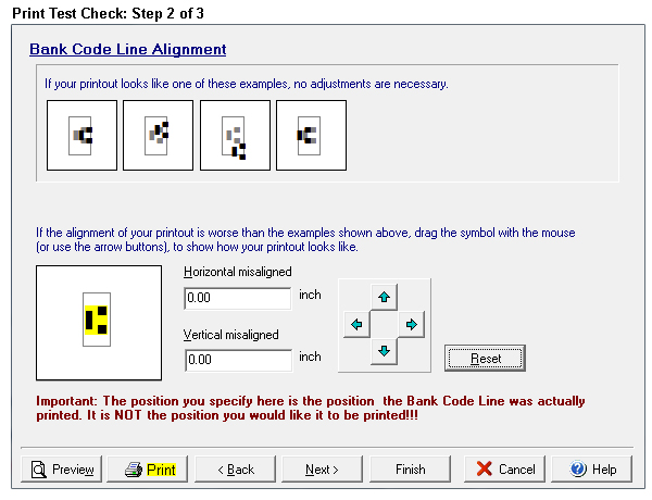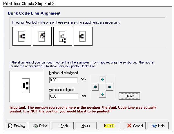 14. Once the adjustment is complete and the print out is correct click on the FINISH button. If the "Do you want to print a test check" window appears, click on the NO button as you have already printed a test.