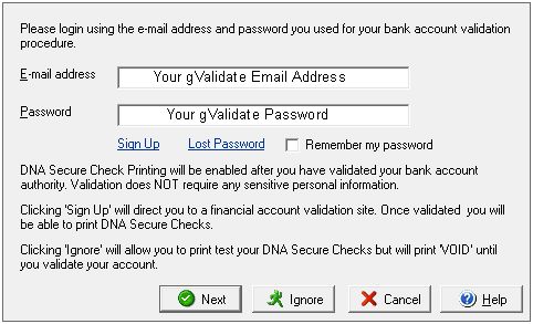 3. When the "Log In To Print And Send" window appears, select the IGNORE button. It is not necessary to log on the gValidate to adjust the bank code line. If you want to print checks after aligning the bank code line, please sign in with your gValidate email address and password.