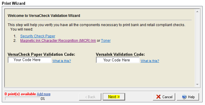 5. If you have not entered and activated both a Paper and Ink validation code you will see the screens below. On the first screen select Next. If you have both codes in proceed to step 8.