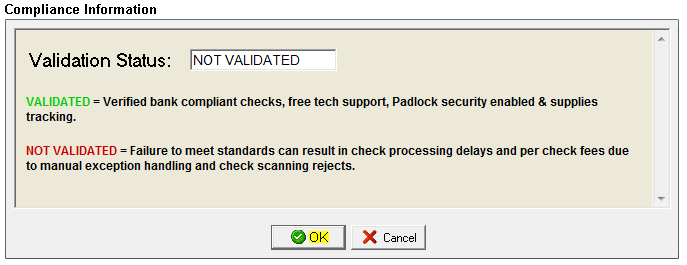 6. The Compliance Information screen will appear. Click on the OK button. Your validation status may differ from what is presented in the screen shot below.