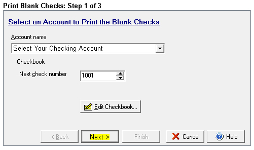 8. The Print Blank Checks Step 1 of 3 screen will appear. Select an account that you have set up, it must have a bank code line. Once the account is selected click on the Next button.