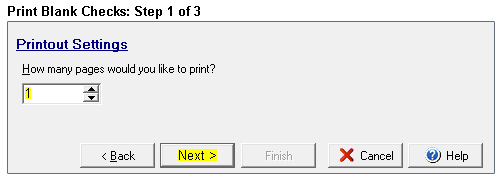 9. The Print Blank Checks Step 2 of 3 screen will appear. Set the "How many pages would you like to print" field to "1". Leave all other settings the same - click the NEXT button when complete.