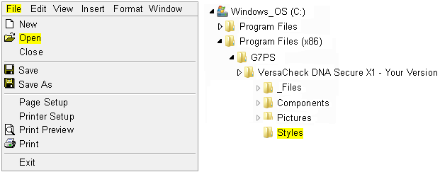 3. Select File Open. Navigate the to following location - C:\\Program Files or Program Files (x86)\G7PS\VersaCheck Your Version\Styles. Select one of the templates that is closest to the type of check you wish to create.