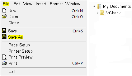5. Once you have made all the changes you wish to the template, select File - Save As. We suggest that you save the template in the VCheck folder where your data file is stored. This allows you to only make a back up of one folder if you need to move the software (this folder will have all data and templates). Navigate to My Documents - VCheck. Give the template a descriptive name and select Save.